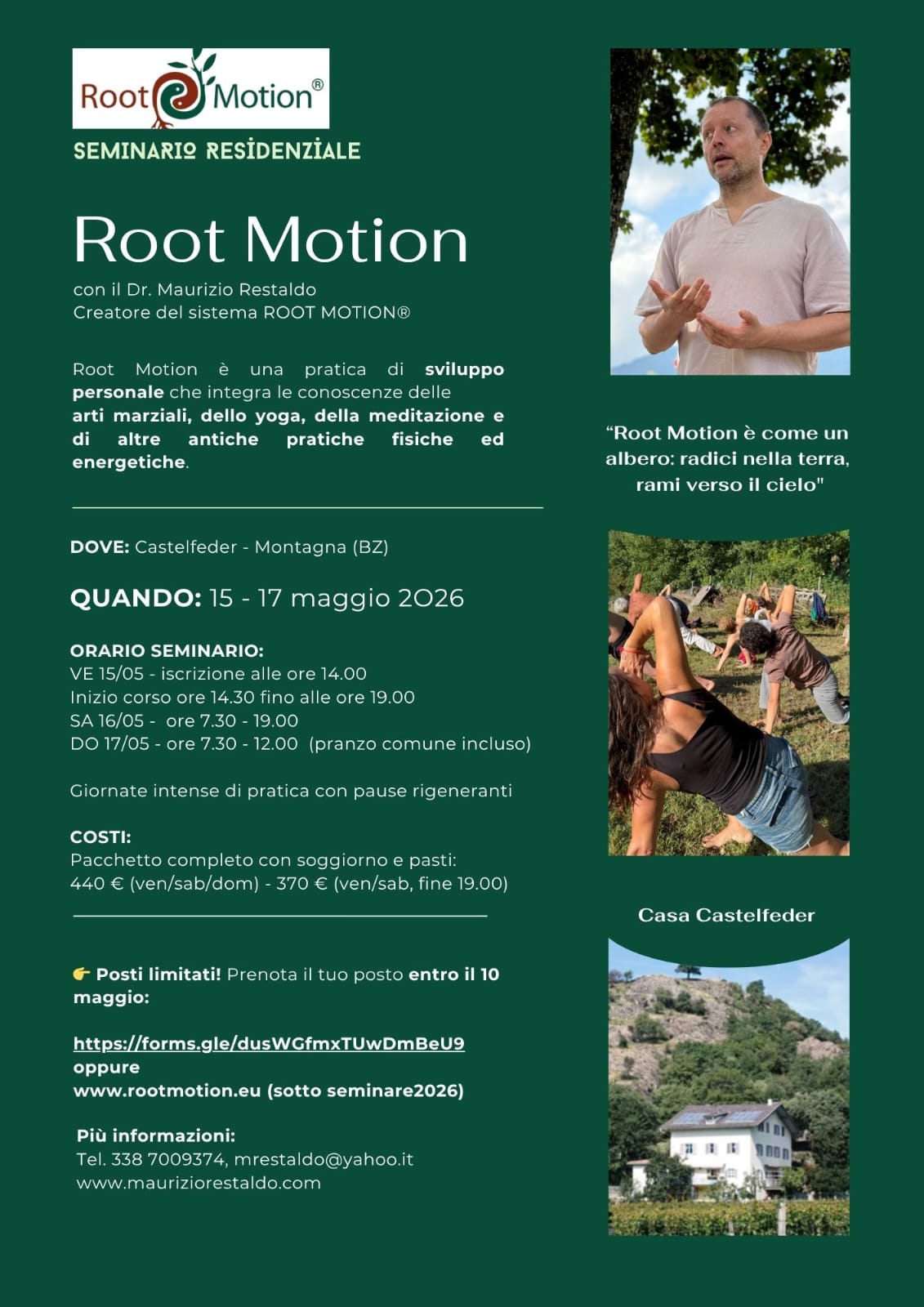 Seminario residenziale di Root Motion condotto dal Dr. Maurizio Restaldo dal 15 al 17 maggio 2026 a Castelfeder (BZ), un'esperienza intensiva che unisce arti marziali, yoga e meditazione per lo sviluppo personale.